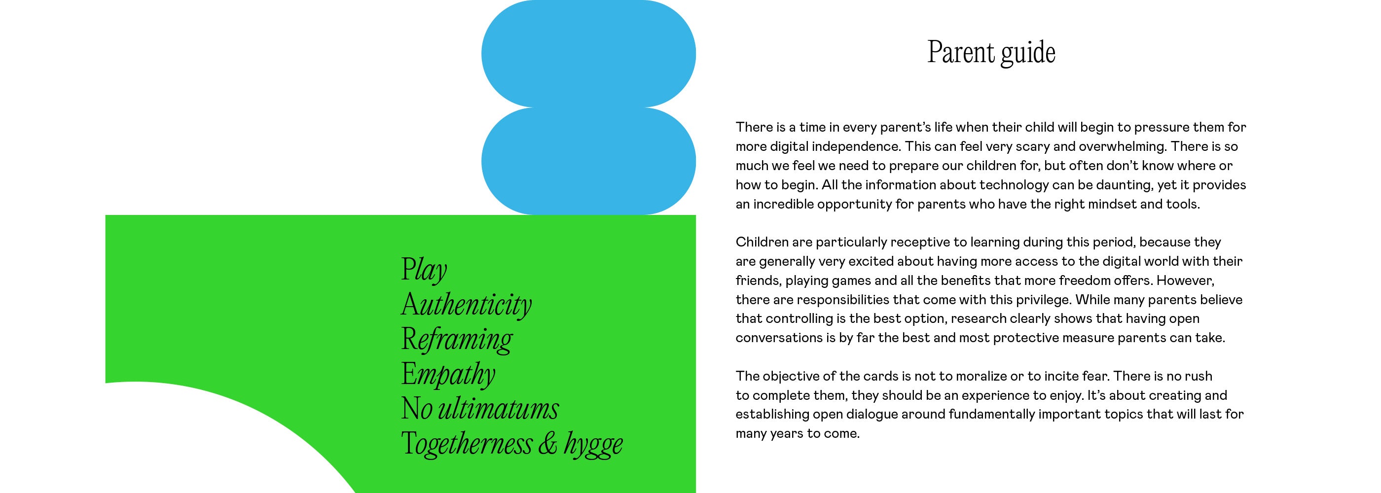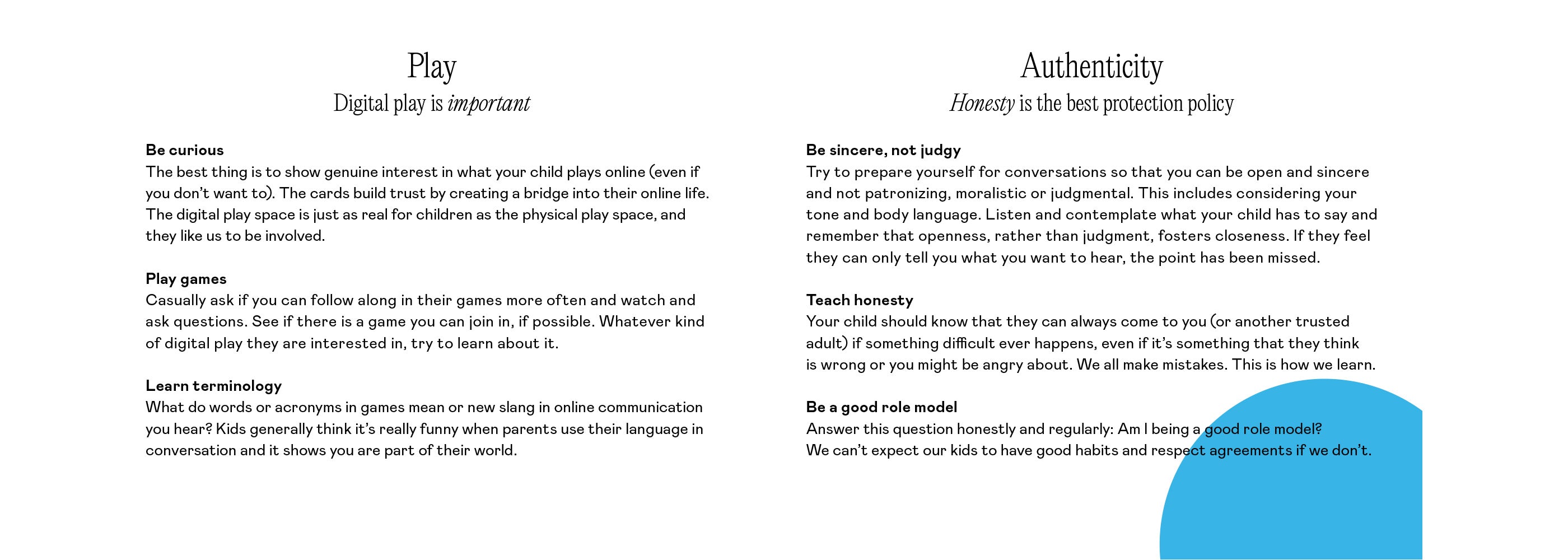The best thing is to show genuine interest in what your child plays online (even if you don’t want to). The cards build trust by creating a bridge into their online life. The digital play space is just as real for children as the physical play space, and they like us to be involved.
